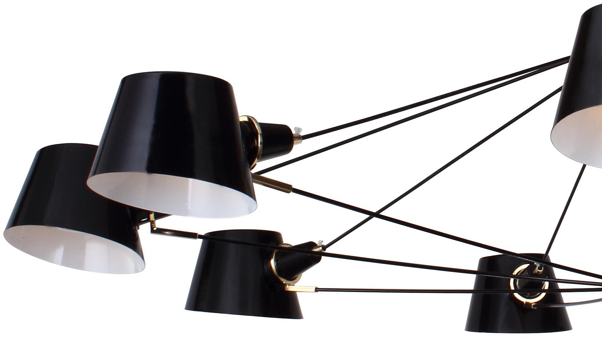 Каркас из металла черного цвета, плафоны из металла черные снаружи и белые внутри, золотые декоративные элементы, сменные лампы. Eimer – одна из самых любимых и востребованных коллекций дизайнеров. Основание черного цвета и плафоны конусной формы выполнены из металла. Направленность плафонов вниз помогает люстре освещать достаточно ярко и мягко. Декоративные элементы на плафонах в цвете золота или хрома добавляют оригинальность этим светильникам.