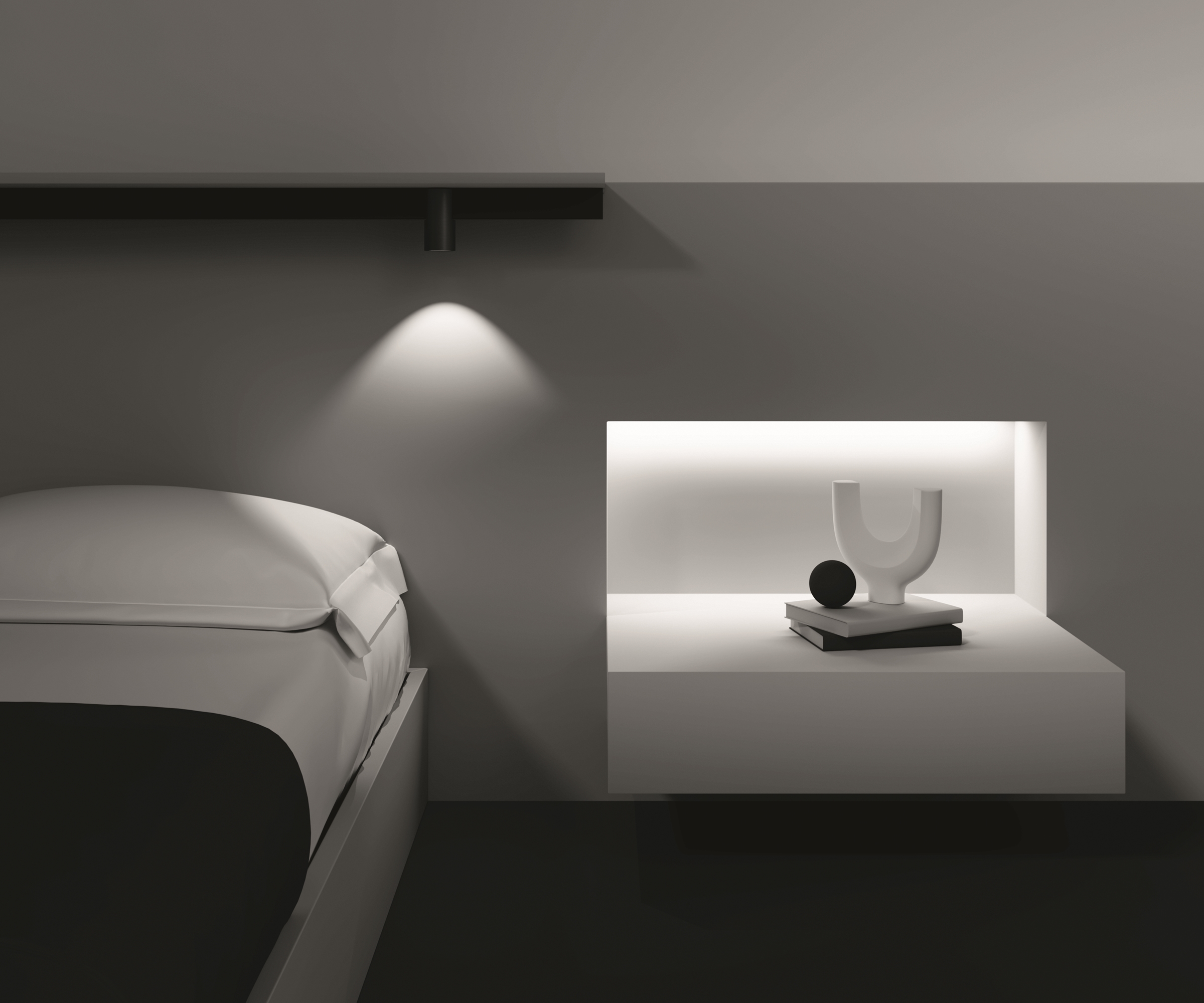 Алюминиевый корпус. Цвета - белый, черный и латунь с черным коннектором для установки в магнитный шинопровод Exility. LED-источник света. Два варианта цветовой температуры - 3000К и 4000К, а также умные светильники с регулировкой цветовой температуры от 3000 K до 6000 K и диммированием по протоколу Bluetooth Mesh. Источник света утоплен вглубь плафона для комфорта зрения. Корпус модели — форма вытянутого куба и цилиндра.